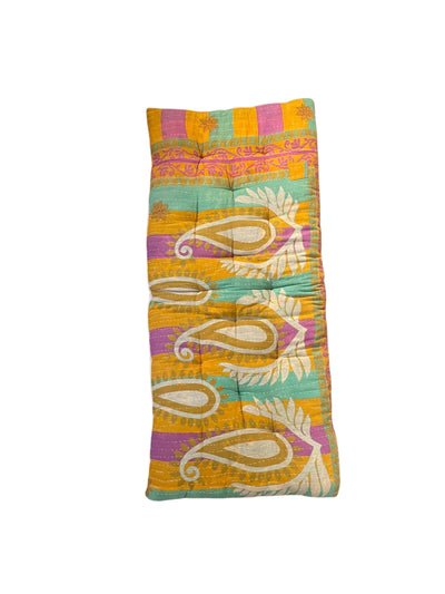 Hos Culture Living designer vi unikke sari madrasser, syet af nøje udvalgte indiske vintage sarier, hvor der kan forekomme små reparationer i form af lapper Hver madras er håndlavet med traditionelle kantha-syninger, en broderiteknik anvendt af indiske kvinder gennem generationer. Da vi selv udvælger sarierne i Indien og får dem syet på vores egen systue, er hver madras helt unik – en smuk kombination af bæredygtighed og autentisk håndværk.
