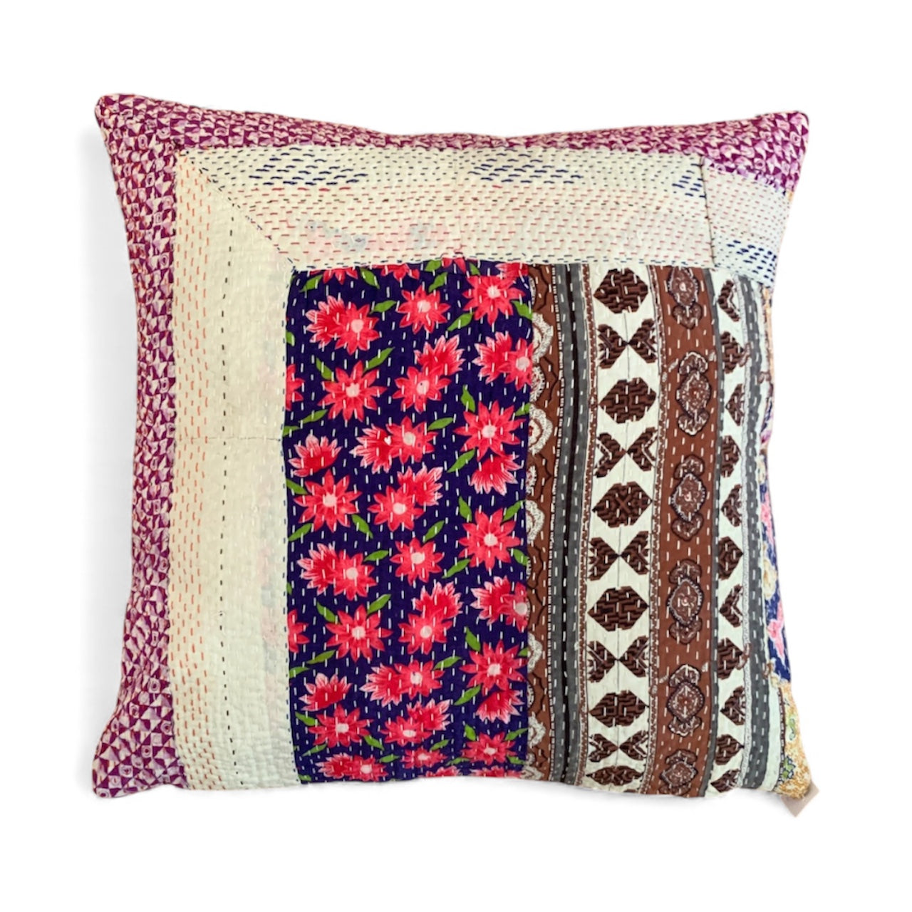 Giv dit hjem et personligt præg med vores unikke sari pudebetræk, lavet af upcyclede indiske sarier. Hver pude er håndlavet med små charmerende detaljer som lapper og reparationer, der understøtter dens historie og karakter. De smukke kantha-syninger, en traditionel indisk broderiteknik, giver hvert betræk ekstra tekstur og autentisk skønhed.